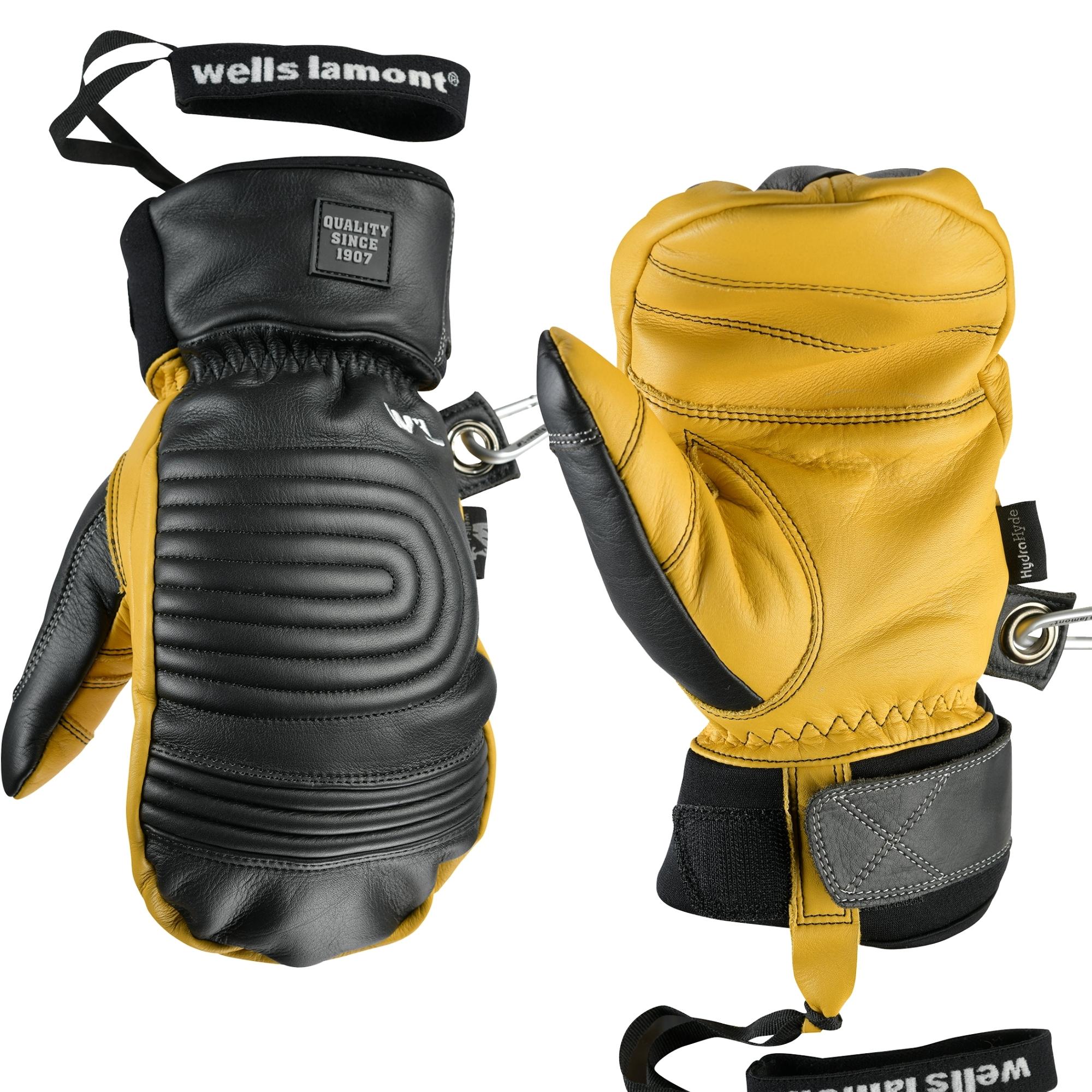 Stay dry and warm with our premium mittens featuring water-resistant HydraHyde® leather and 3M™ Thinsulate™ insulation. SBR foam padding offers added comfort and durability. Includes a waterproof Hipora® insert, removable ski strap leather pull tab, and carabiner for convenience.