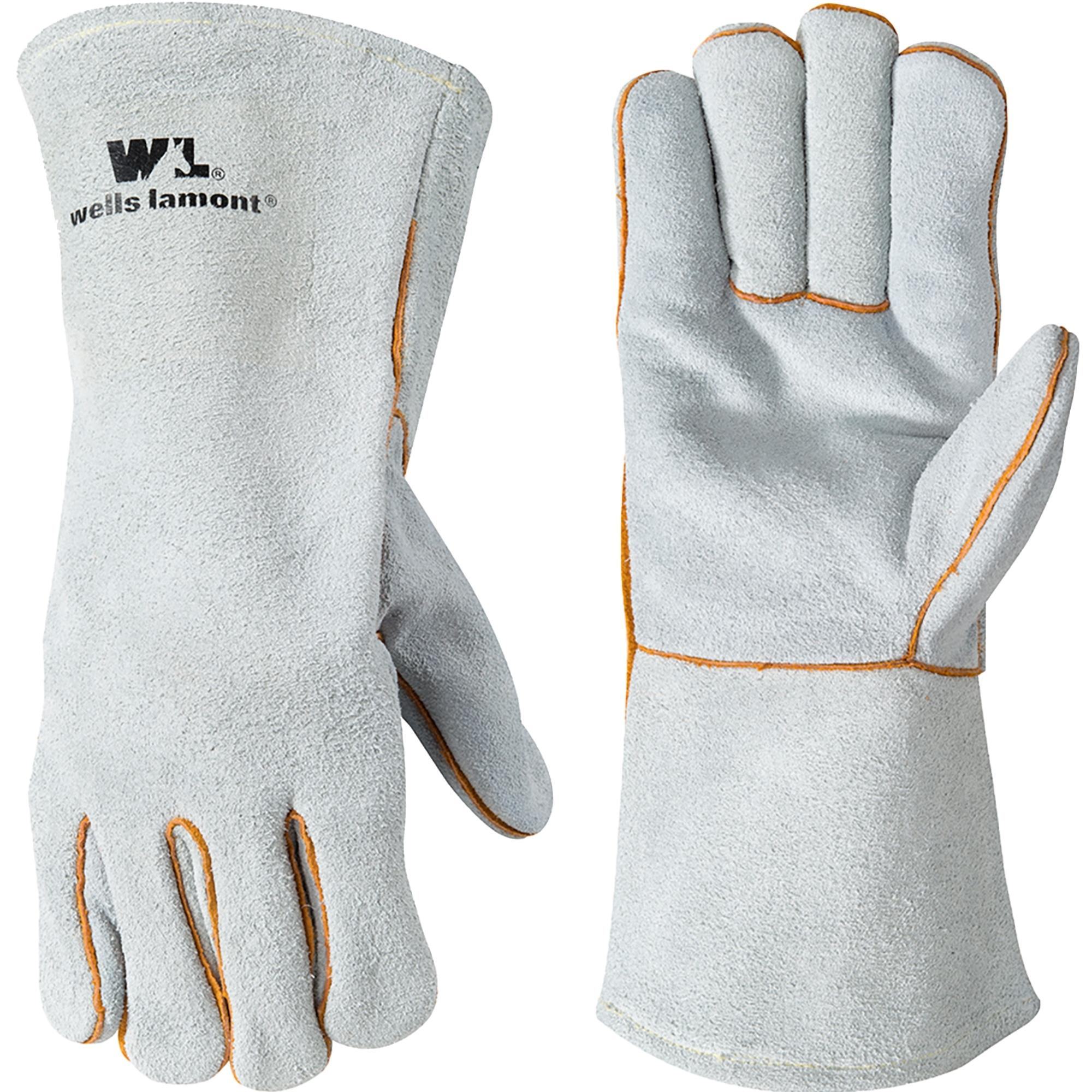 Durable split cowhide gloves, sewn with kevlar thread and featuring welted seams, offer robust protection and heat resistance. Ideal for welding, camping, and outdoor cooking.
