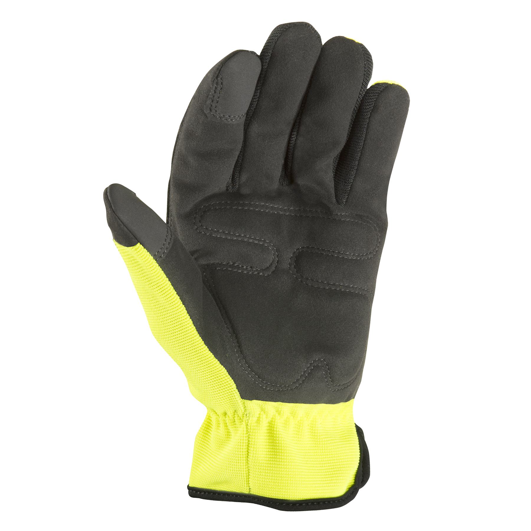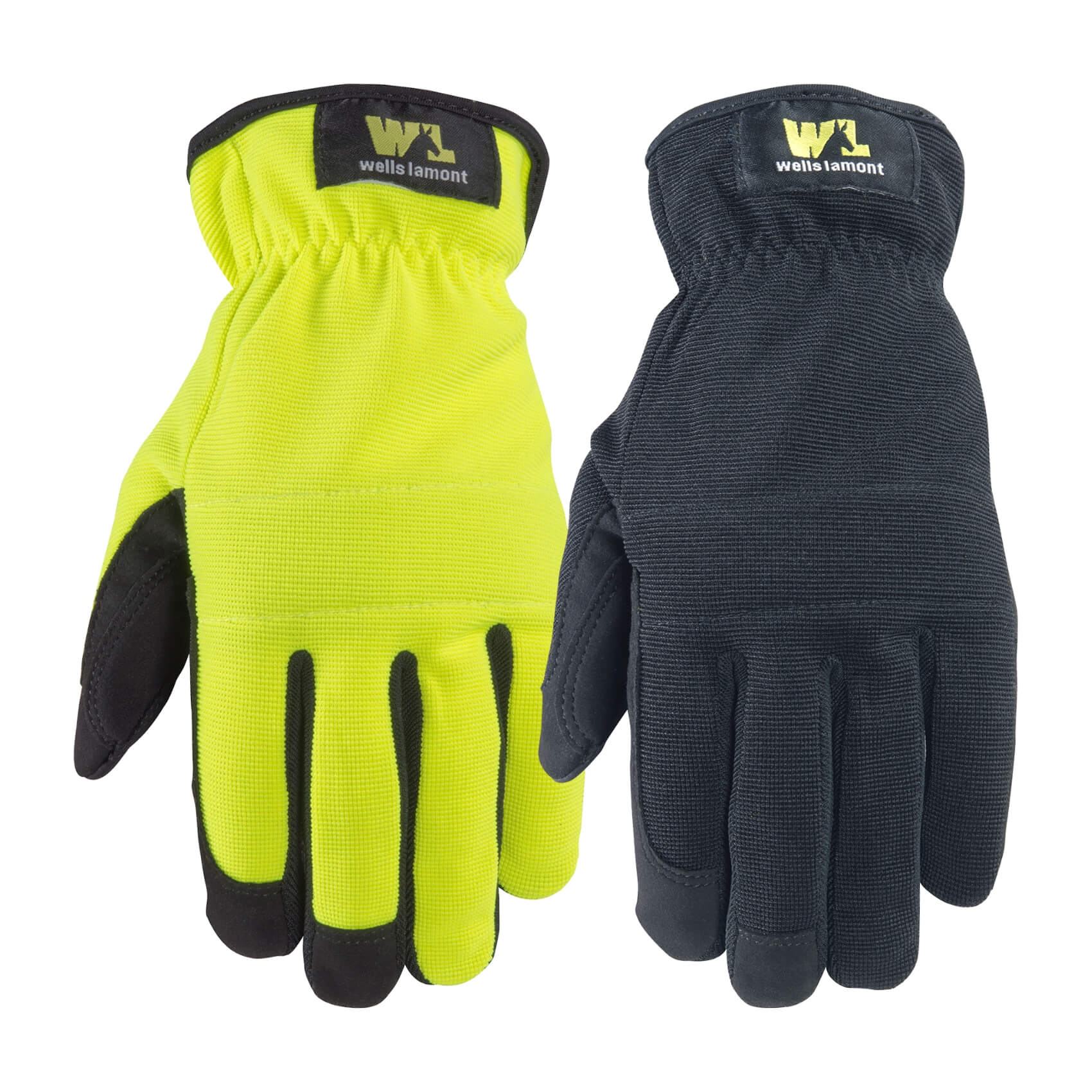 Machine washable synthetic leather palm. Stretch fit spandex back. Lightly padded knuckle & palm. Easy on & off slip-on design. Touchscreen technology keeps you connected. Each pack contains 1 pair of high visibility Gloves and 1 pair of black gloves.